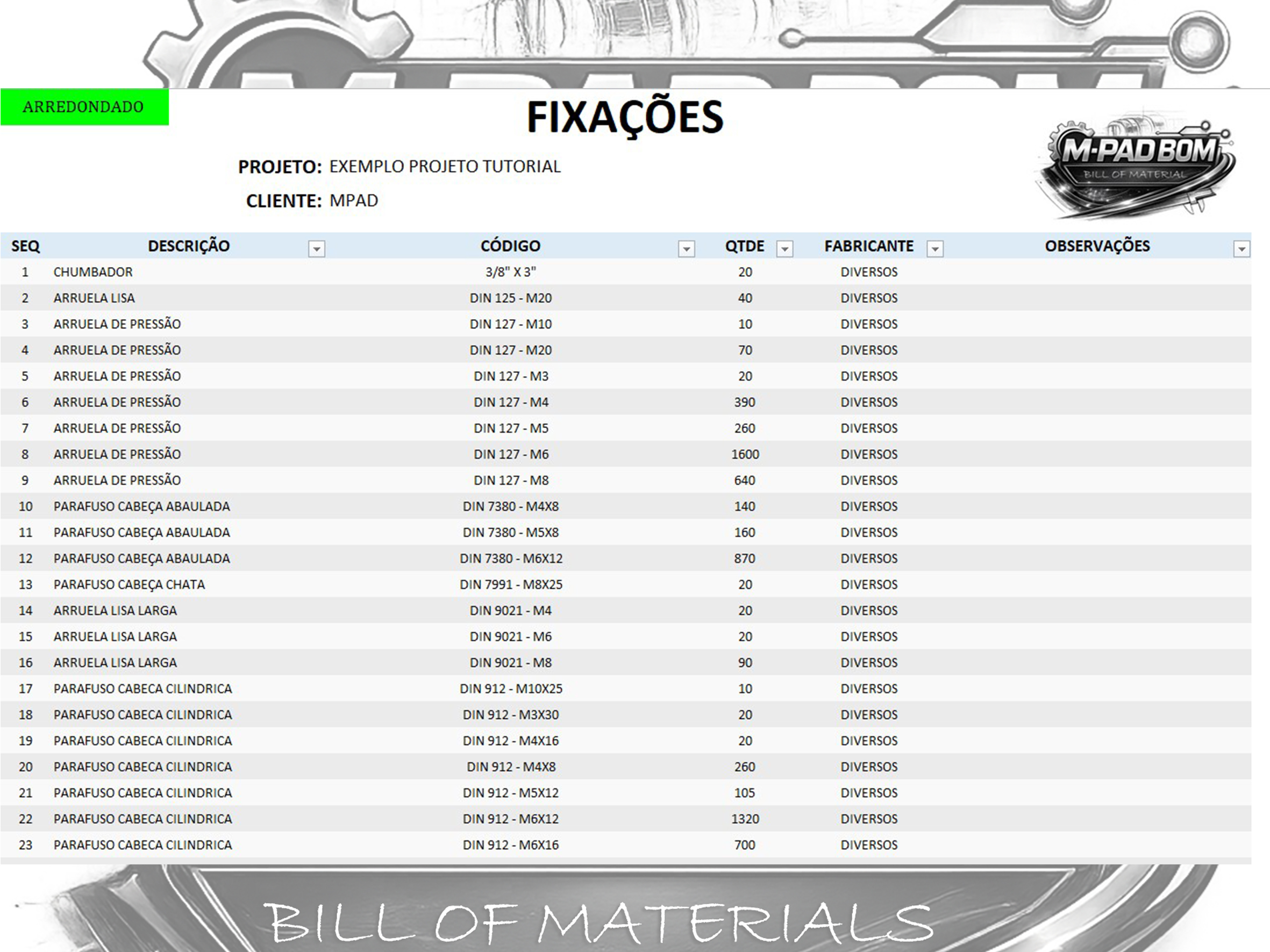 A M-PAD BOM realiza o arredondamento automático de itens de fixação, garantindo quantidades corretas para compra e evitando falta ou excesso de materiais no projeto.