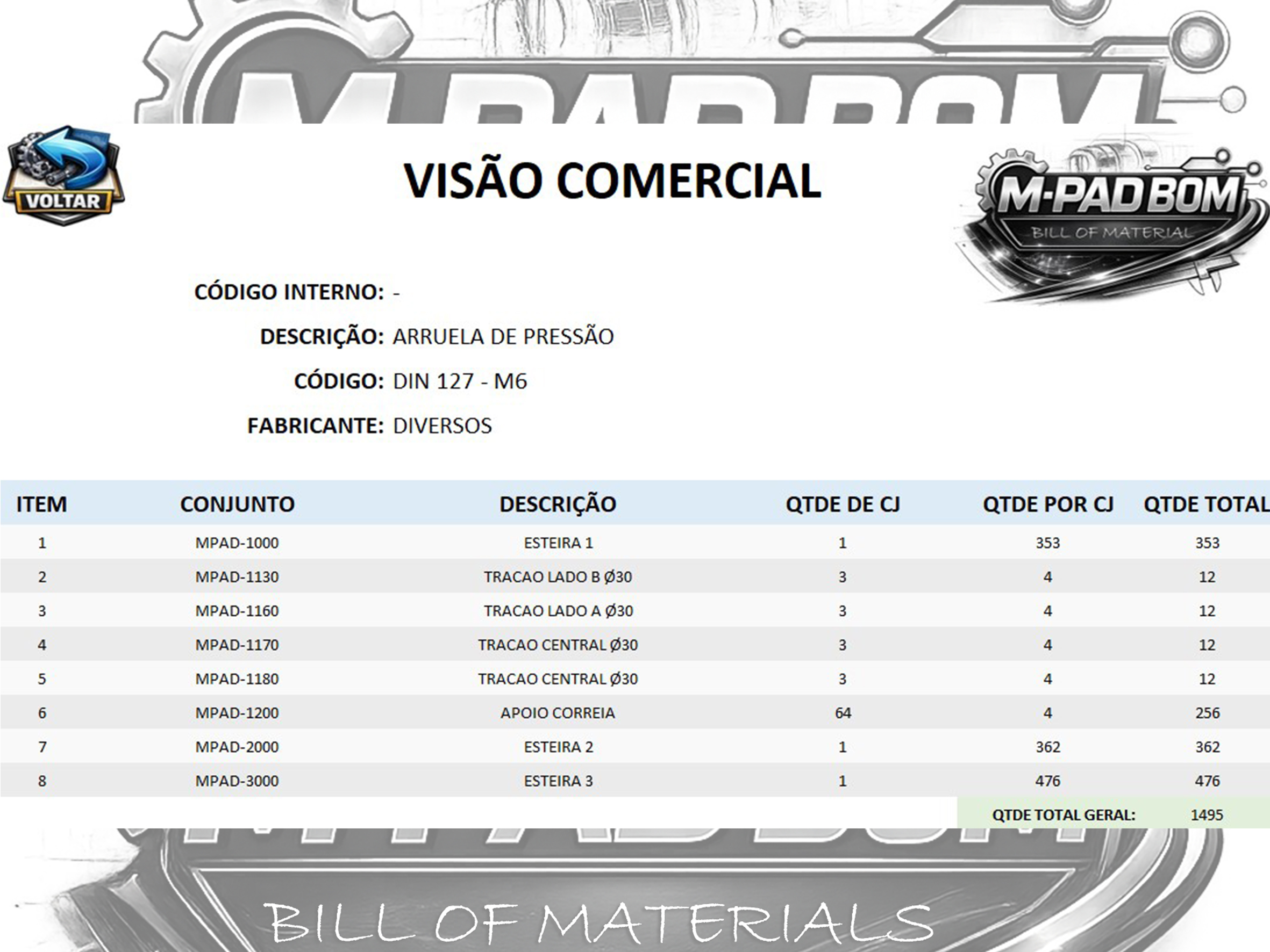 A M-PAD BOM realiza a contagem total de cada item e indica exatamente em quais conjuntos ou subconjuntos a peça será utilizada, garantindo rastreabilidade, clareza e controle completo do projeto.