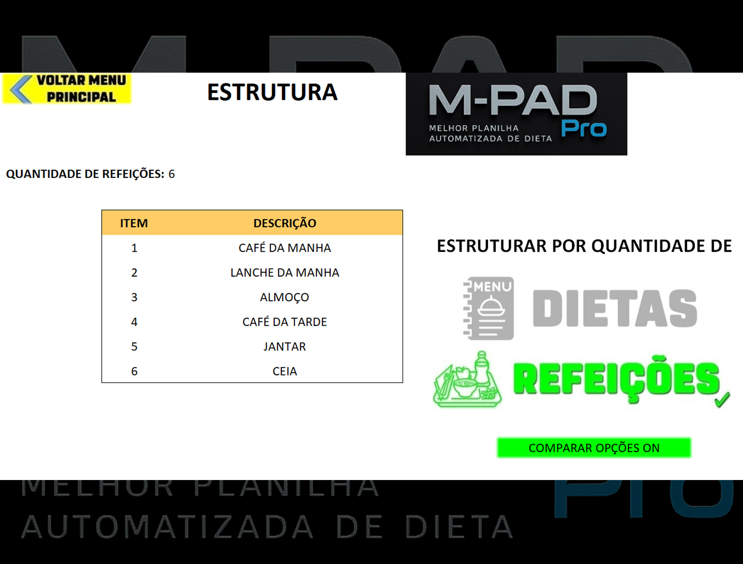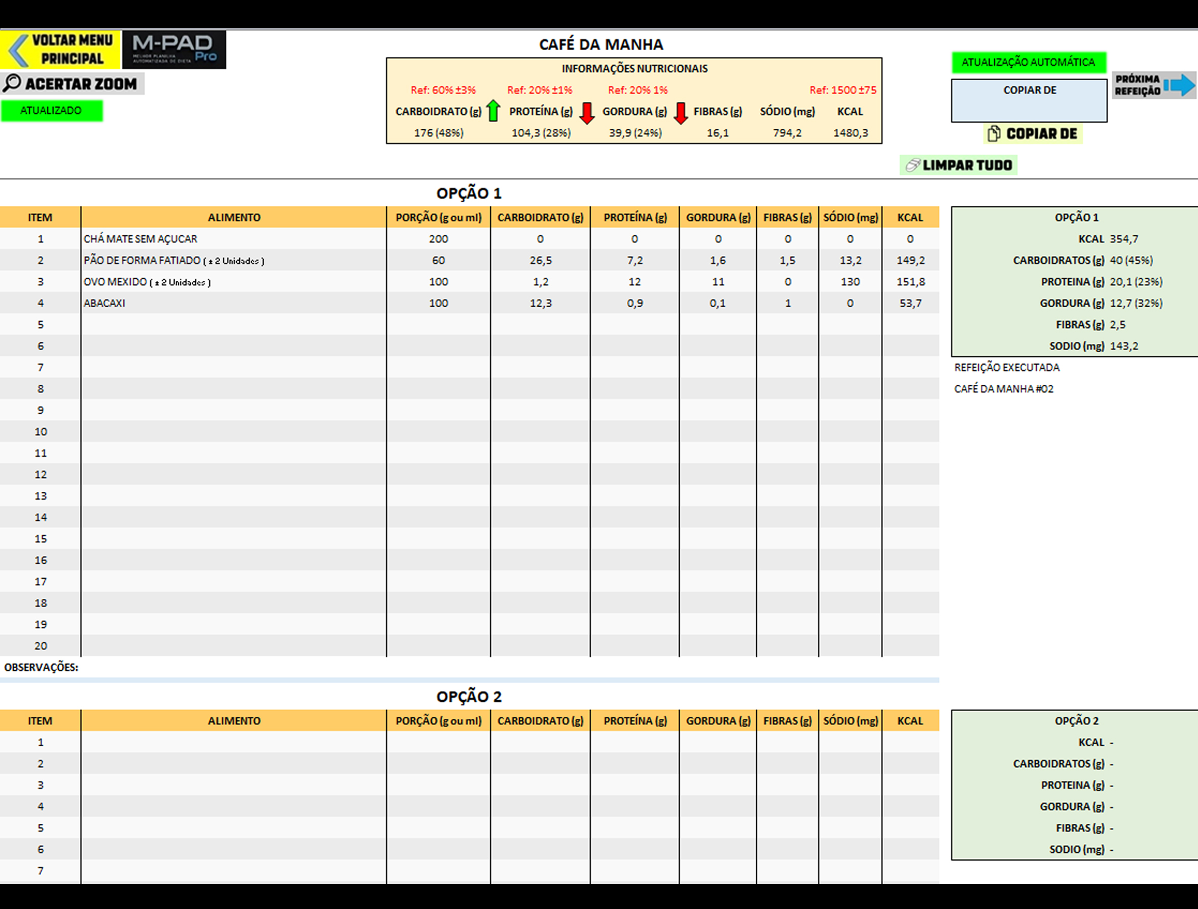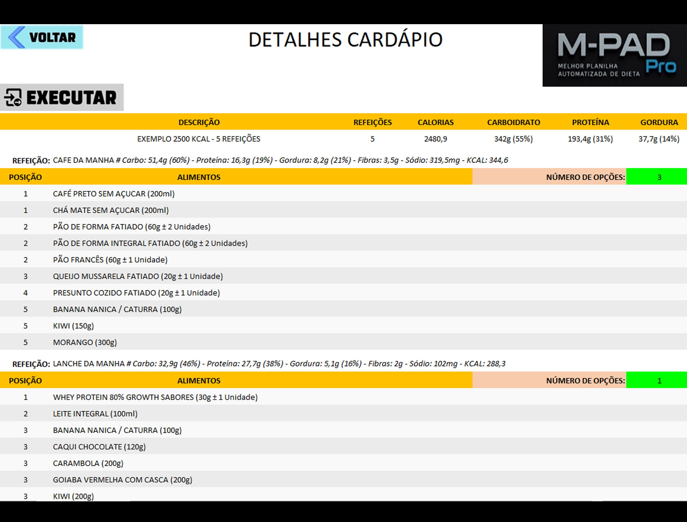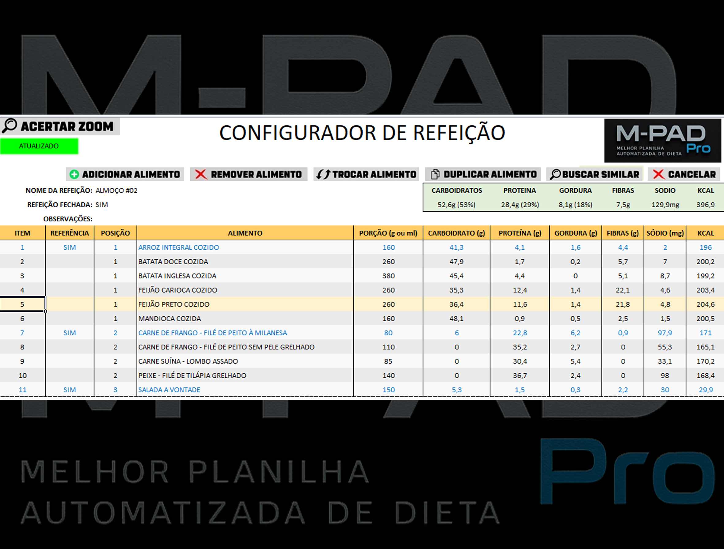 Crie refeições completas, incluindo todas as possibilidades de substituições de alimentos. A cada execução, a própria planilha escolhe automaticamente a opção a ser utilizada, garantindo variedade, praticidade e todas as macros calculadas sem esforço.