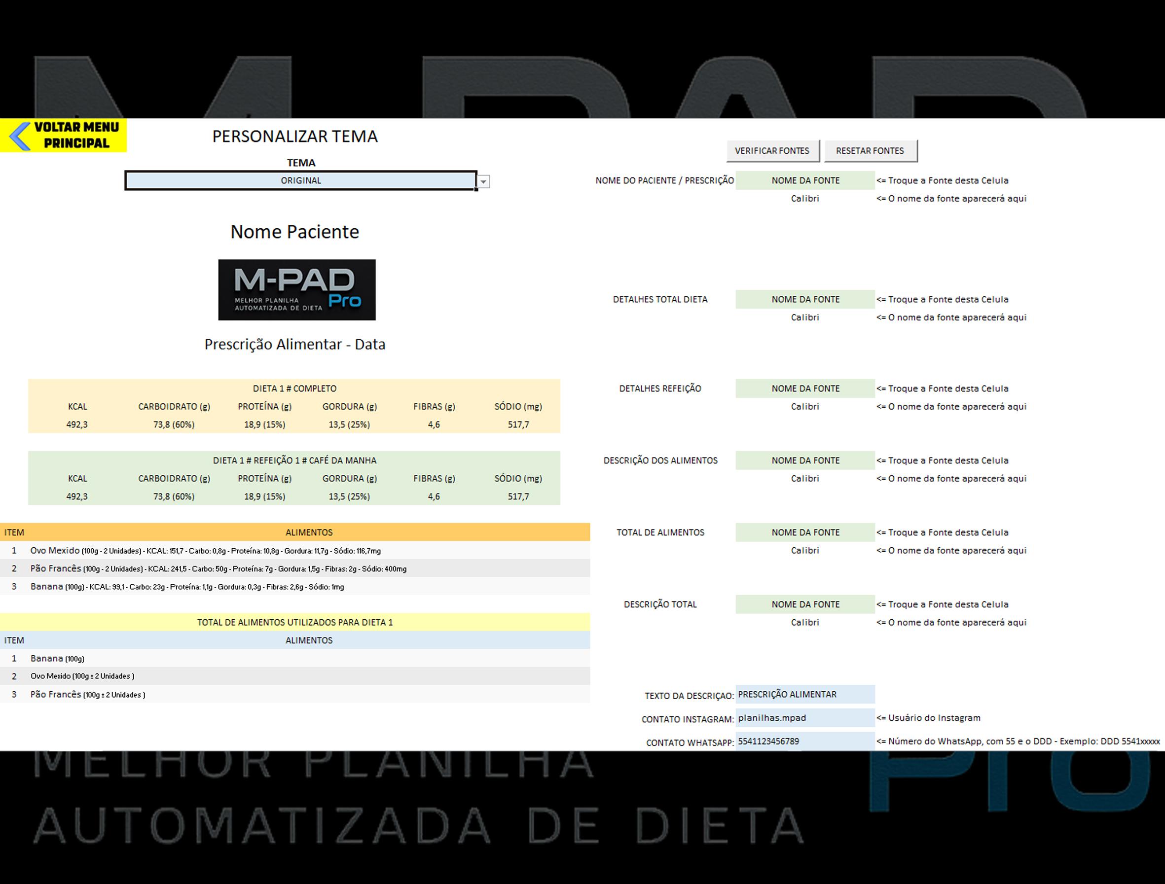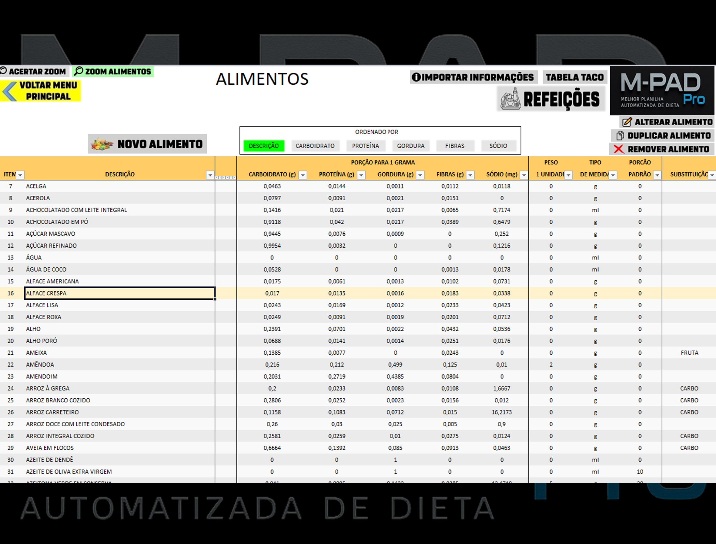Adapte a planilha à sua realidade. Insira, edite ou remova alimentos do banco de dados e trabalhe sempre com as opções que você realmente utiliza. Com a personalização, sua prescrição fica muito mais prática, completa e do seu jeito.