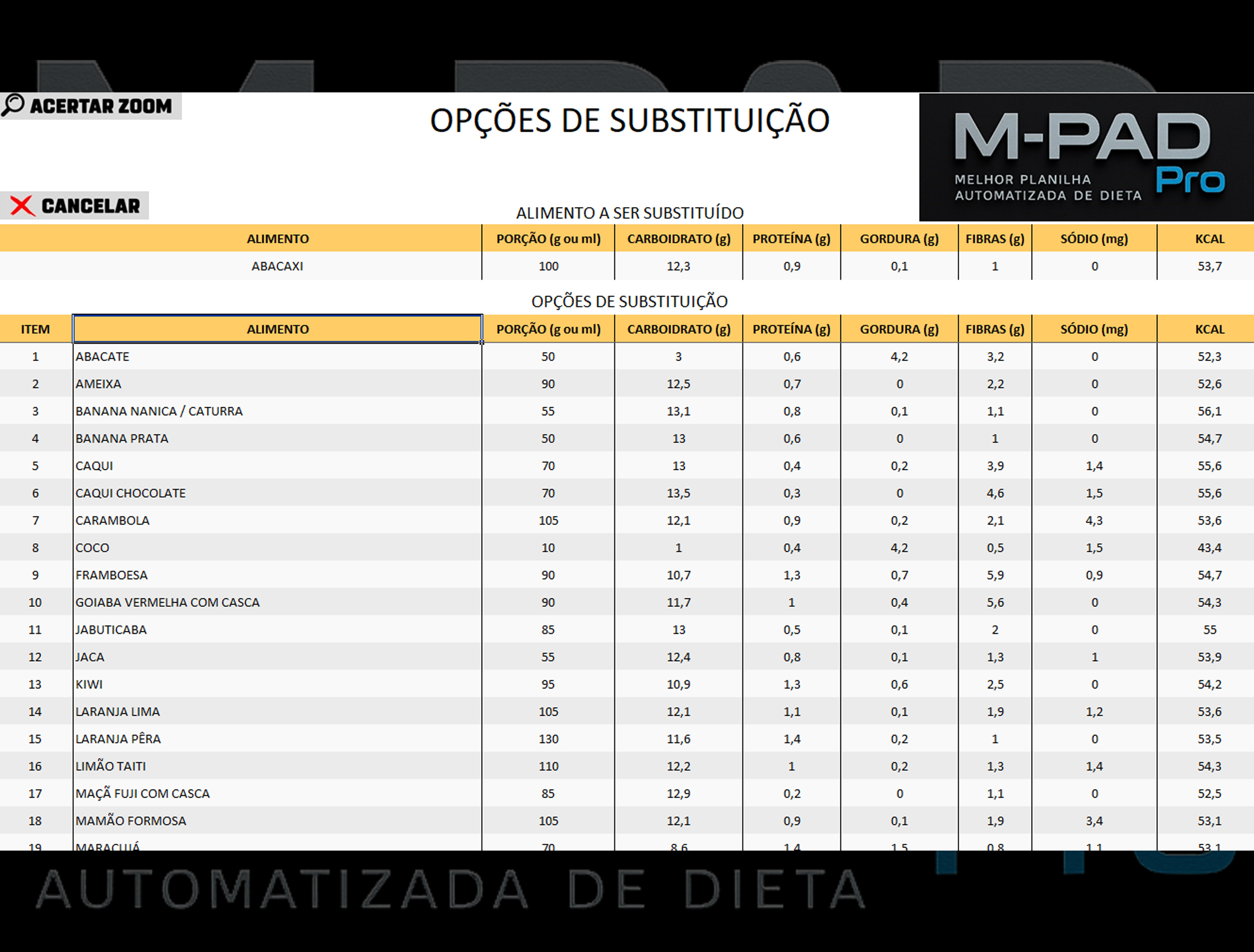 Insira a quantidade de substituições que você deseja e a planilha organiza tudo. O seu cardápio completo e suas substituições em segundos.