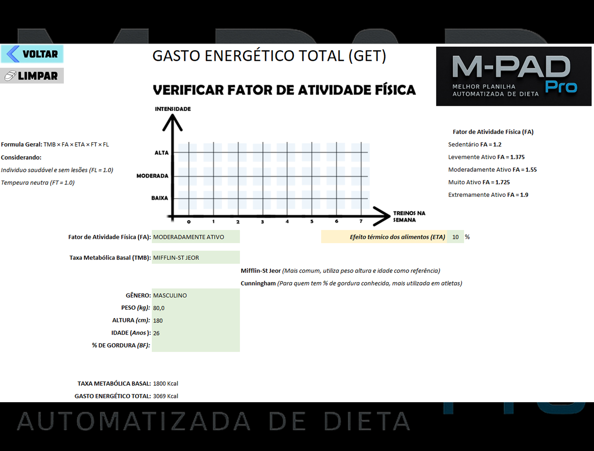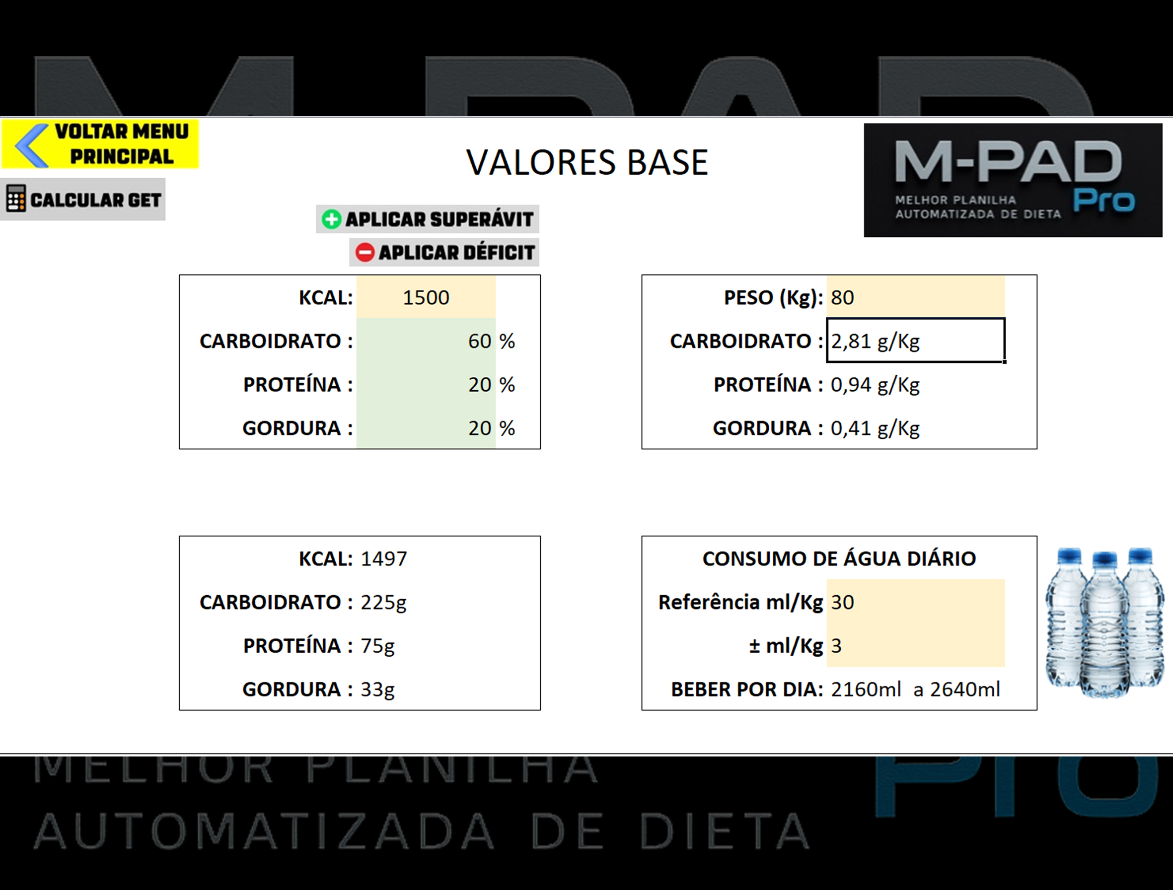 Defina as calorias e as porcentagens ideais de cada macronutriente, e deixe a planilha guiar você durante a montagem. Assim, cada prescrição fica equilibrada, precisa e de acordo com os objetivos definidos.
