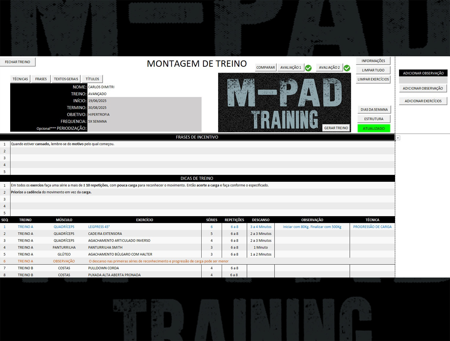 Veja de perto como funciona a planilha que redefine a automação. A M-PAD Training foi criada para ser intuitiva, prática e completa. Cada tela foi pensada para simplificar seu trabalho e entregar exatamente o que você precisa, no momento certo.