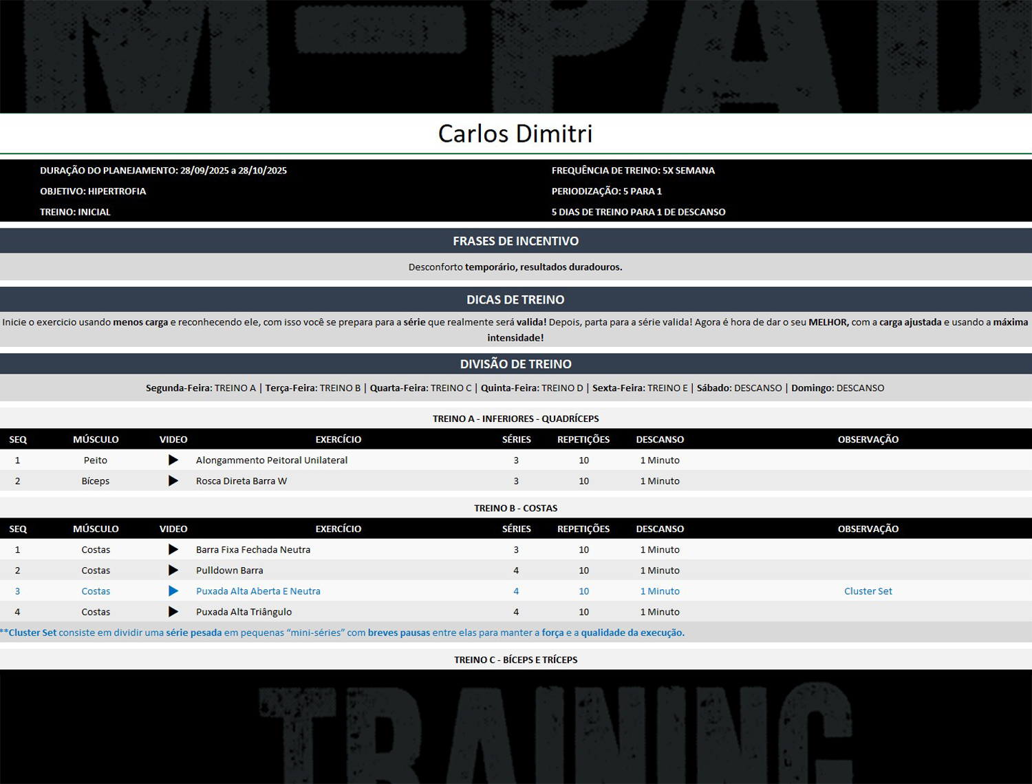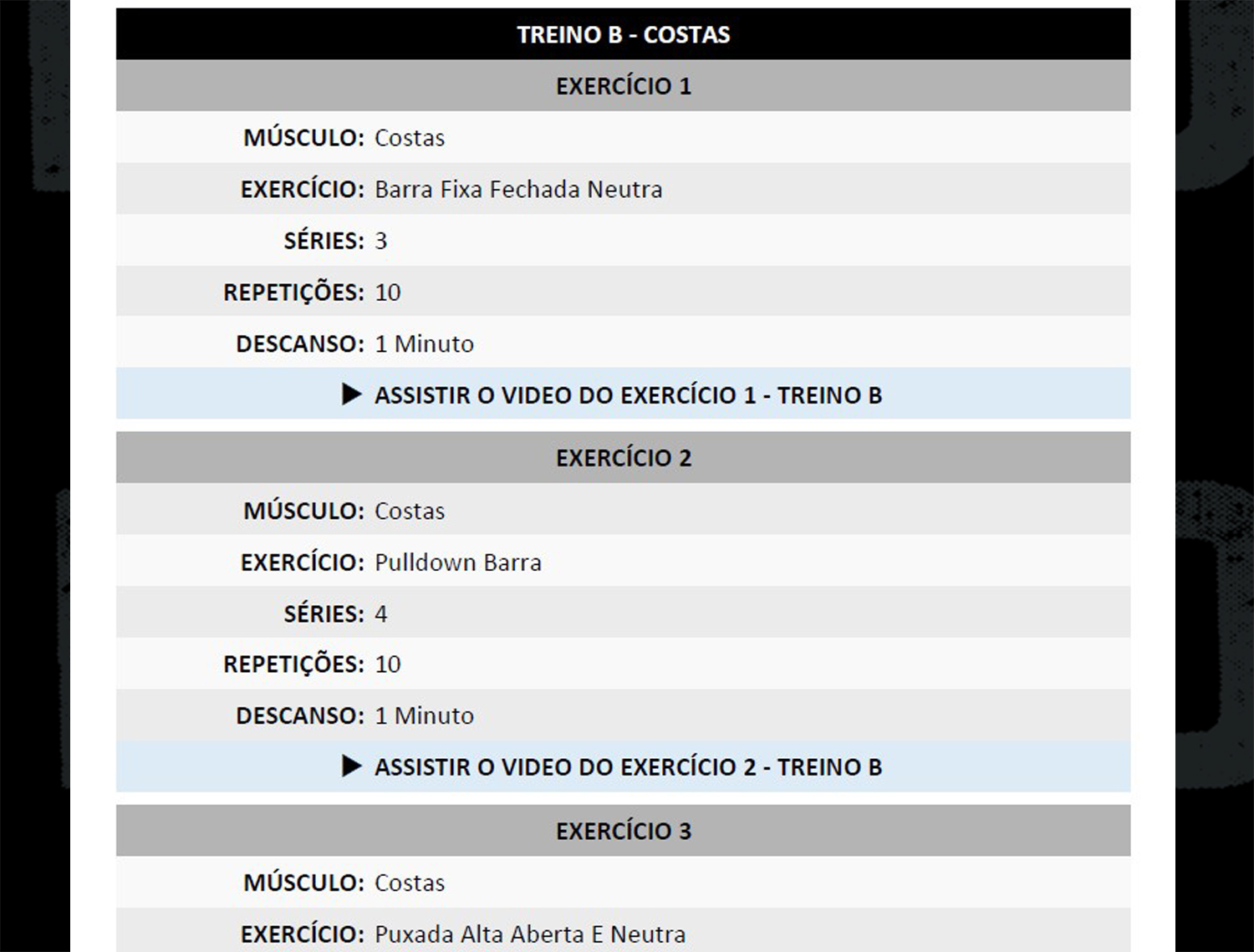 Ficha de treino pensada para visualizar em dispositivos móveis, com informações distribuídas na vertical.